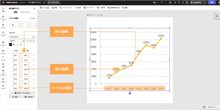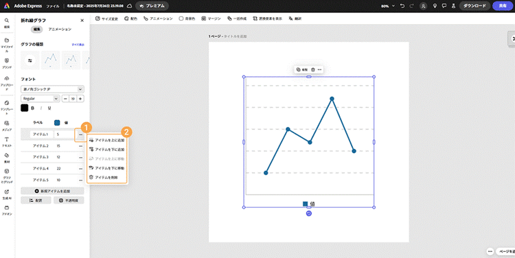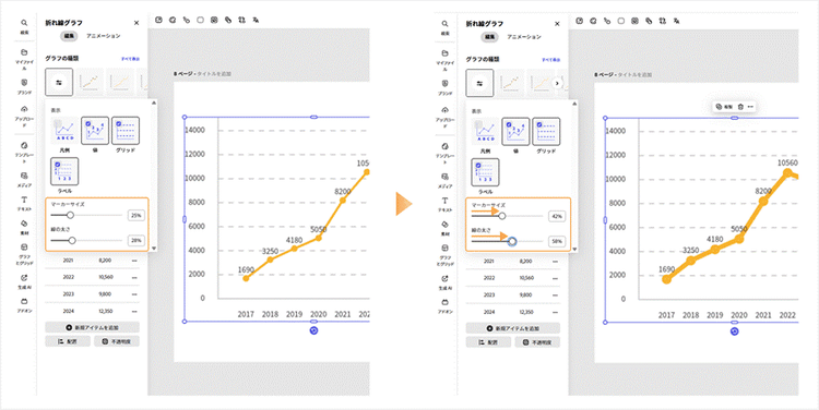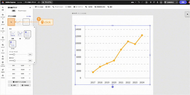 Adobe Expressでは、線の色や太さ、マーカーサイズなどを細かく調整でき、シンプルながら視認性の高いグラフが手軽に作れます。