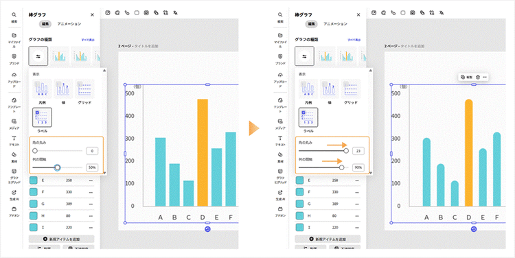 「角の丸み」は値を大きくするほど棒の角が丸く、「列の間隔」は値を大きくするほど棒同士の間隔が広がります。見た目の調整もスライダーひとつで直感的に行えます。