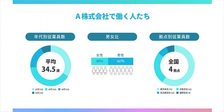 以下の例は、グラフとアイコン・ピクトグラムを組み合わせて、会社紹介の資料をインフォグラフィックとして魅せる演出をした例です。