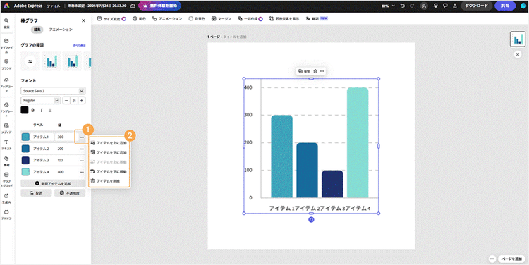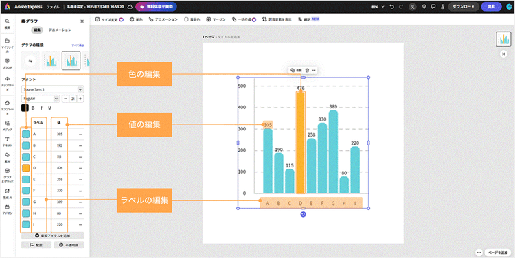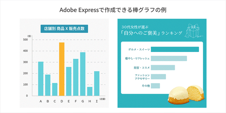 Adobe Expressなら、項目名と数値を入力するだけで棒グラフをカンタンに作成でき、色や間隔なども自由にカスタマイズ可能です。