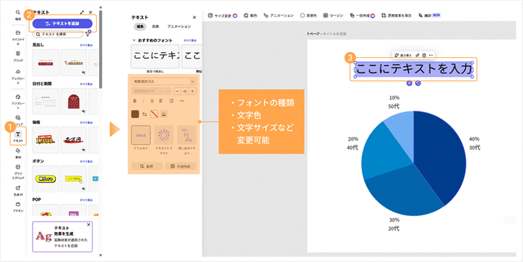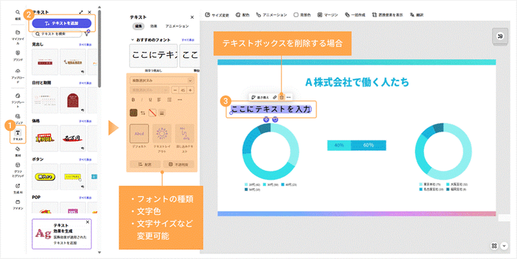 ● 追加:「テキスト」>「テキストを追加」をクリックしてテキストボックスを配置