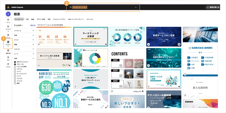 「テンプレート」をクリックし、検索窓に「プレゼンテーション」と入力するか、以下のリンク先からテンプレートを探してみてください。