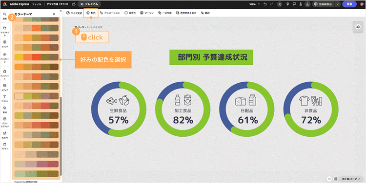 Adobe Expressには、あらかじめ用意されたカラーテーマ(バランスのよい色の組み合わせ)をワンクリックで適用できる「配色」機能があります。