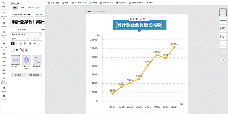 グラフ機能とあわせて、テンプレートやデザイン素材を活用すれば、見栄えのよいプレゼン資料やインフォグラフィックも手軽に作成できます。