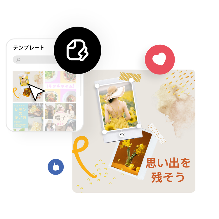アニメーションは、フォトコラージュに視線を集められる効果的な方法です。数十種類のアニメーションスタイルから選択し、デザイン内の写真やテキストに動きを加えることができます。また、GIFアニメーションを使ったスタンプをコラージュに追加することもできます。完成したコラージュはMP4などの動画ファイルとしてダウンロードして、Facebookで共有しましょう。