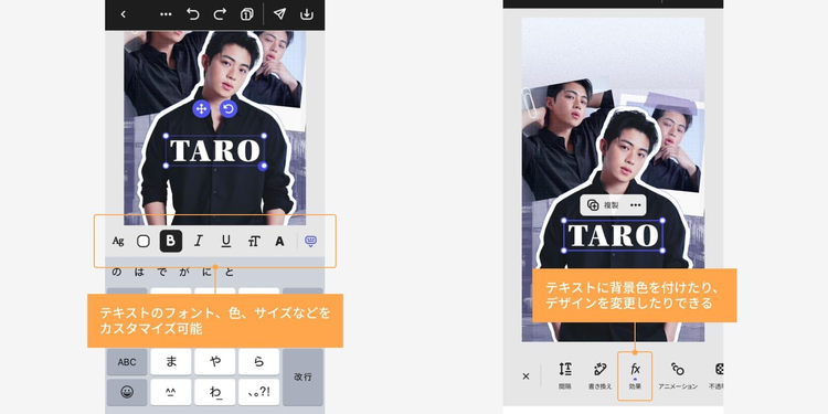 また、「効果」からは、テキストに背景色をつけたり、切り抜いた推しの輪郭に合わせてテキストを半円状に配置したりと、デザインの変更も可能です。アイデアに合わせて楽しくアレンジしましょう。
