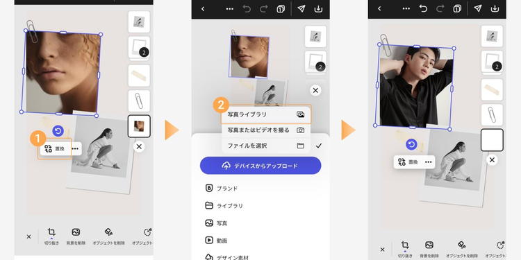 写真を選択し、「置換」をタップします。その後、「デバイスからアップロード」>「写真ライブラリ」の順に進み、手もちの写真に変更してください。