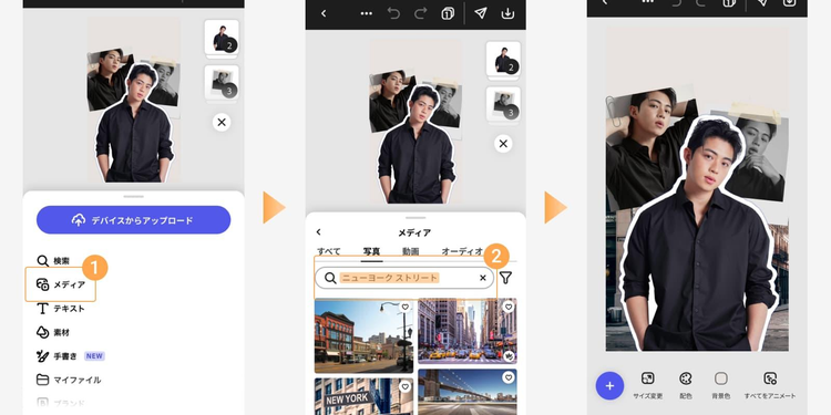 まず、「+」ボタン>「メディア」の順にタップし、検索窓にキーワードを入力して、好みの画像を選びましょう。