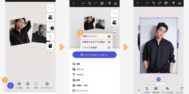 もし、お手持ちの写真を使いたい場合は、「+」ボタン>「デバイスからアップロード」に進んでください。