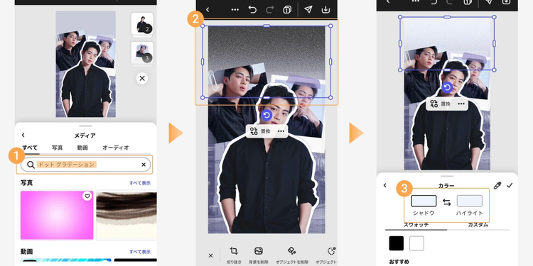 「+」ボタン>「メディア」から「ドット グラデーション」と検索し、素材を追加します。
