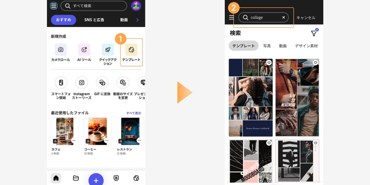 まずは、ホーム画面の「テンプレート」をタップし、検索窓に「コラージュ」や「collage」と入力してください。