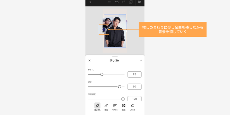 次に、推しのまわりに少し余白を残しながら、背景を消していきます。