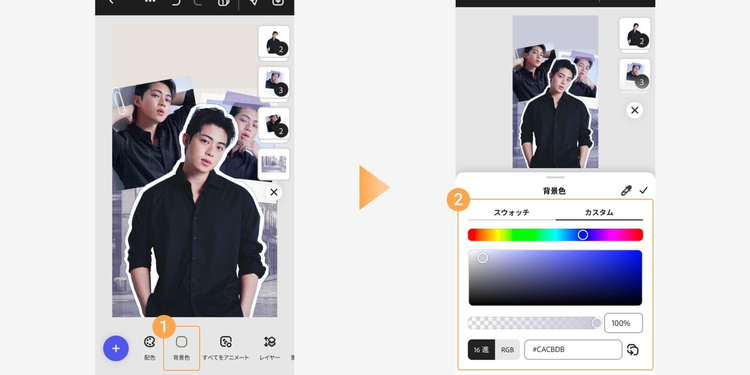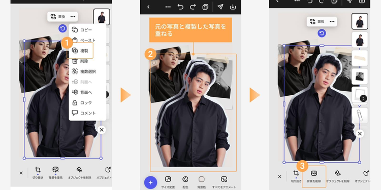 複製できたら、2枚をぴったり重ね、手前の写真を選択した状態で「背景を削除」をタップしましょう。