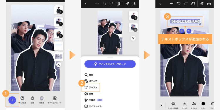 テキストを追加するには、「+」ボタン>「テキスト」をタップします。