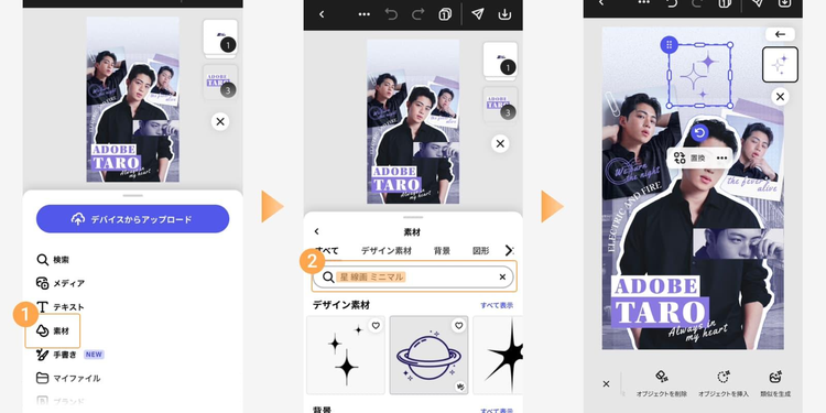 「+」ボタン>「素材」を選び、検索窓にキーワードを入力して、気に入った素材をタップするだけで、カンバスに追加できます。