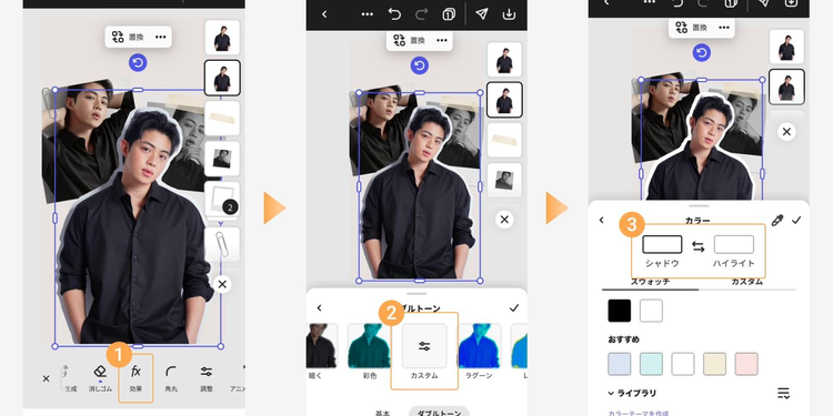 続いて、下になっている推しの写真を選択し、「効果」>「トーン」>「カスタム」の順に進み、「シャドウ」と「ハイライト」を両方とも白色に設定してください。