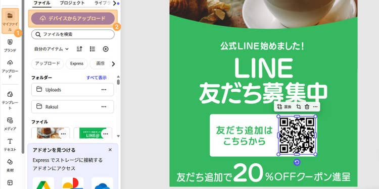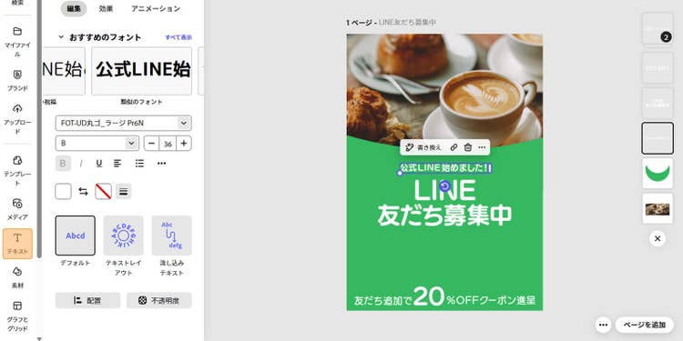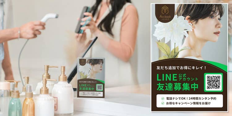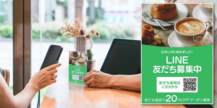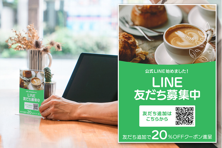 作ったデザインは、店頭に設置するだけでなく、LINE公式アカウントと一緒に活用するのもオススメです。友だち追加やクーポン配信といった機能を組み合わせれば、リピーター獲得にも直結します。