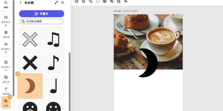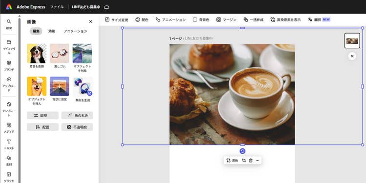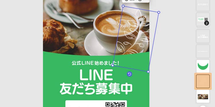 配置後はカンバス上で画像を動かし、見せたい要素がバランスよく収まるようにサイズを調整してください。今回は、コーヒーがメインの被写体となるよう拡大し、カンバスの上部に画像を配置してみました。