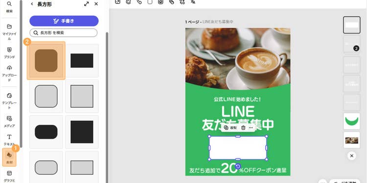 「素材」>「図形」から長方形や曲線など好みの図形を選択し、ポップに情報を載せるスペースを作ります。図形の色は店舗やブランドのキーカラー、または目立たせたい色に合わせると、全体のトーンがまとまりやすくなります。