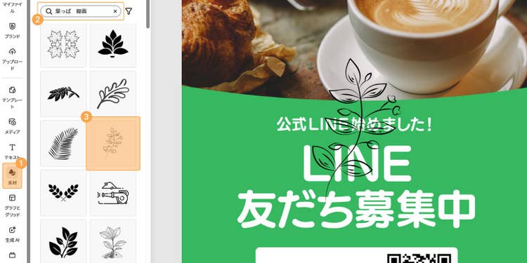 今回は「素材」から「葉っぱ 線画」と検索し、好みのアイテムを選択します。