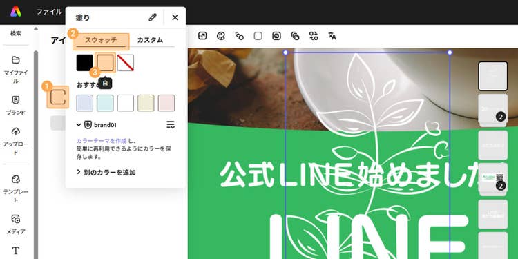 素材を選んだ状態で「アイコン」メニューの「塗り」をクリックし、「スウォッチ」や「カスタム」から任意の色を選ぶと、素材の色を変更できます。