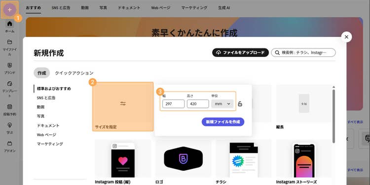 Adobe Expressのホーム画面左上にある「+」アイコンをクリックし、メニューから「サイズを指定」からお好みのサイズを入力しましょう。