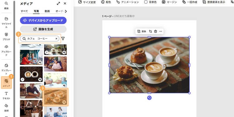 検索窓に「カフェ コーヒー」といったキーワードを入力して素材を探しましょう。