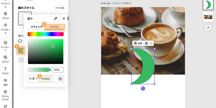 今回は「カスタム」タブの「16進」の箇所に「#35B85F」と入力し、グリーンのカラーを指定します。