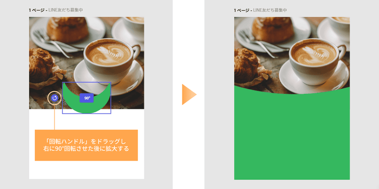 次に、図形をクリックすると表示される「回転ハンドル」をドラッグして右に90°回転させ、カーブが写真の下部を包み込むように大きく拡大してください。