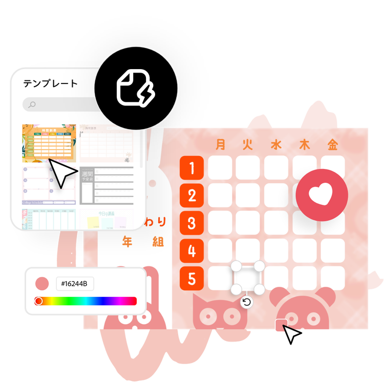 プロがデザインしたテンプレートを眺めながら、アイデアを練りましょう。デザインがすでに決まっている場合は、白紙の状態からすべて自分でデザインすることもできます。写真、アイコン、ロゴ、フォントなど、カスタマイズ可能な素材を活用すれば、組織や団体のカラーが反映されたオリジナルのスケジュール表を作成できます。