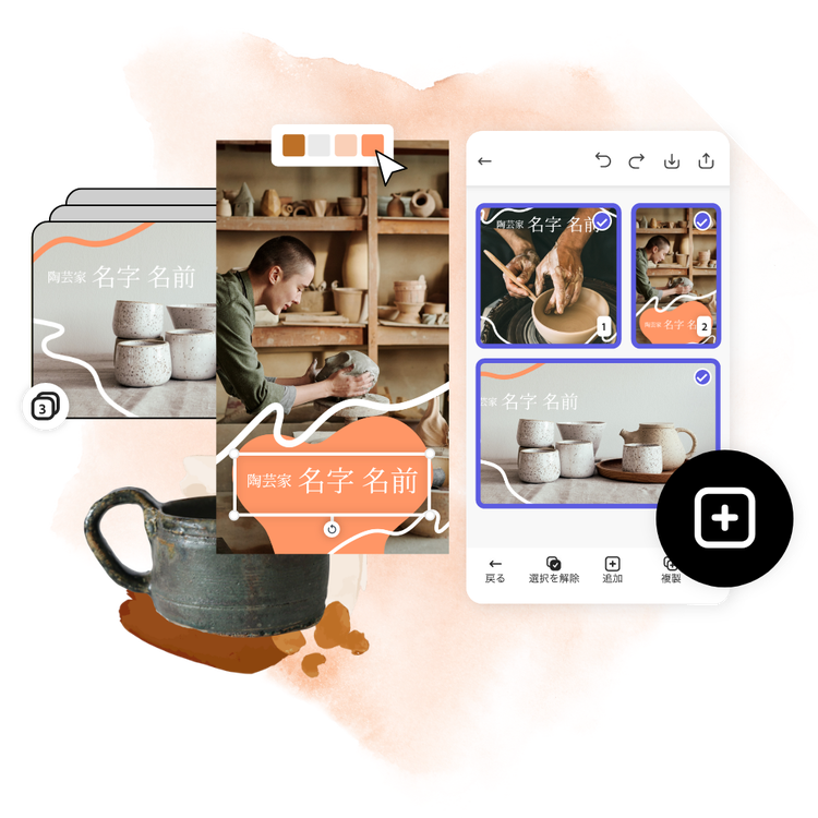 複数ページ機能により、各種SNS向け画像をカルーセル投稿(複数投稿)にかんたんに変換できます。編集画面から直接ページを追加してコピーしたり、複数のページを一括編集したり、オリジナルのページテンプレートを作成したりできます。