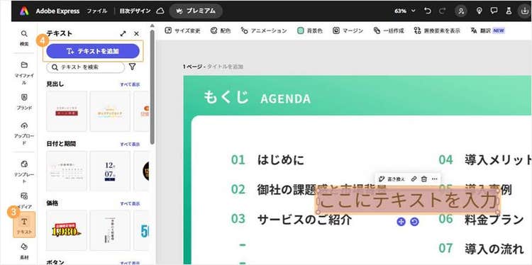 ここからは、Adobe Expressで目次をデザインする手順を解説します。