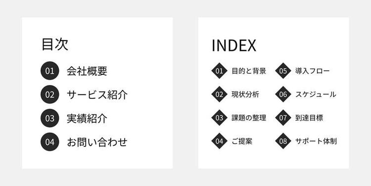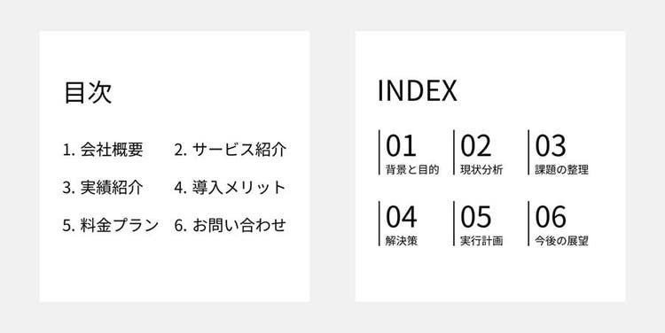 提案書やプレゼン資料、雑誌、パンフレットなど、多くの文書にとって目次は欠かせない要素です。