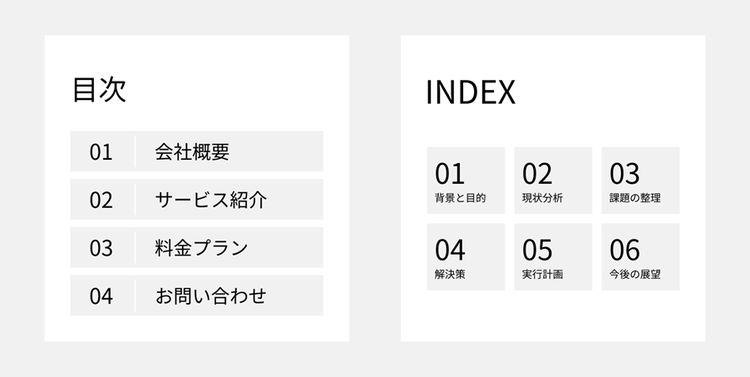 このように、目次のデザインパターンを知っておくと、どのような構成や見せ方が自分の目的に合っているかをイメージしやすくなります。