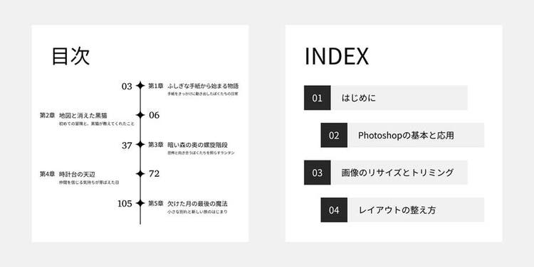 こうした工夫によって、見やすさとデザイン性を兼ね備えた目次に仕上がります。