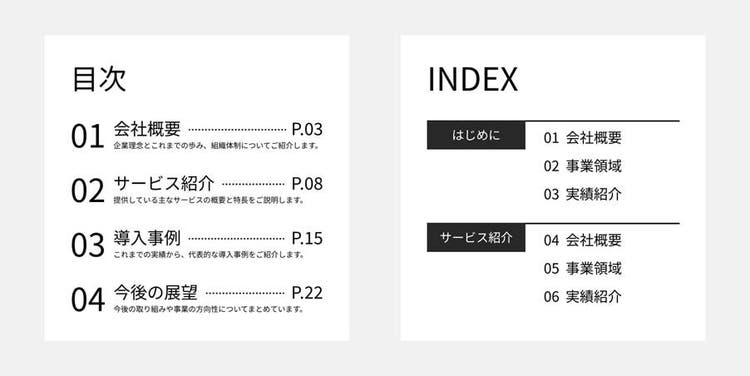 目次は、文書全体の流れをひと目で把握できる機能性に加え、読み手が思わず本文を読みたくなるようなデザイン性も重要です。