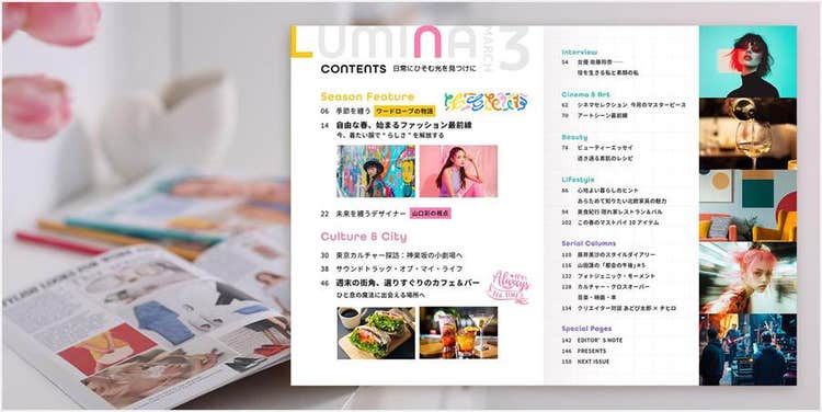 雑誌やパンフレットに最適なスタイリッシュな目次など、様々な媒体に合うデザインをカンタンに作成できます。