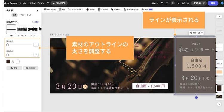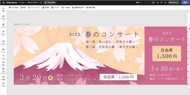 今回はベーシックなデザインに仕上げましたが、Adobe Expressにはデザイン素材やフォントが豊富に揃っており、工夫次第でよりユニークなチケットを作成可能です。