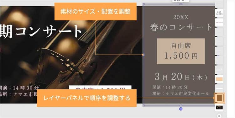 チケットの大きさに合わせて素材をドラッグし、サイズを調整しましょう。