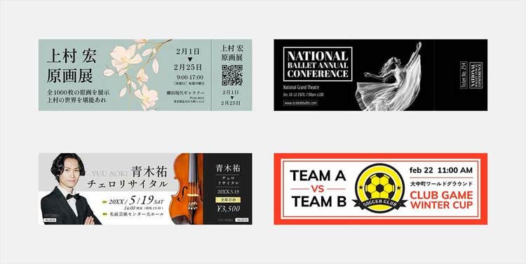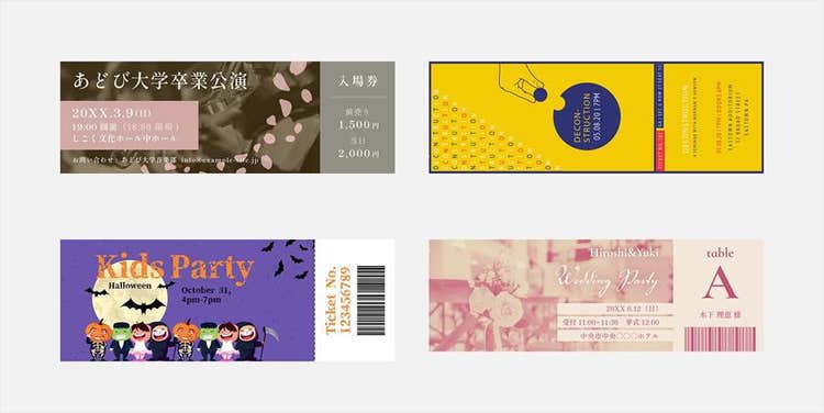 用途に合ったテンプレートを選び、画像やテキストを差し替えるだけで、おしゃれで機能的なチケットをすぐに作成できます。