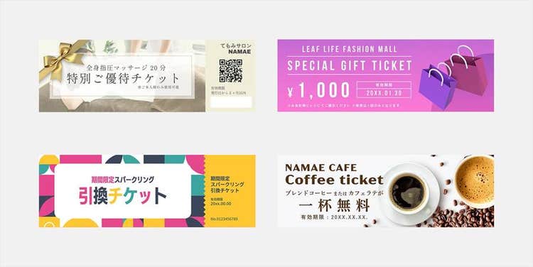 ライブや展覧会などの有料イベント向けのチケットから、習い事の発表会や地域イベントの入場券、抽選券や割引券など販促に役立つチケットまで、プロが手がけたテンプレートが豊富に揃っています。