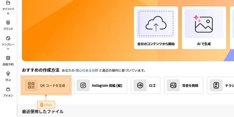 Adobe Express内の素材を追加するには、まず「素材」をクリックします。