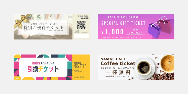 用途に合ったテンプレートを選び、画像やテキストを差し替えるだけで、おしゃれで機能的なチケットをすぐに作成できます。