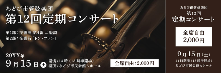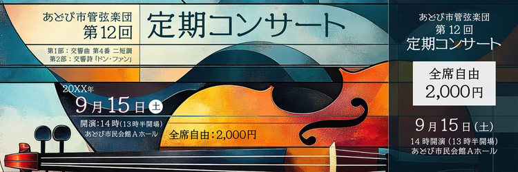 例えば、以下のようにバイオリンのイラストを大胆に取り入れると、視覚的なインパクトが強まり、イベントの印象をより深く残す効果も期待できるでしょう。