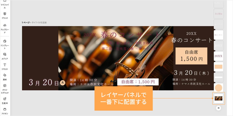 こうすることで、写真素材がテキストや他の素材の下に表示されます。