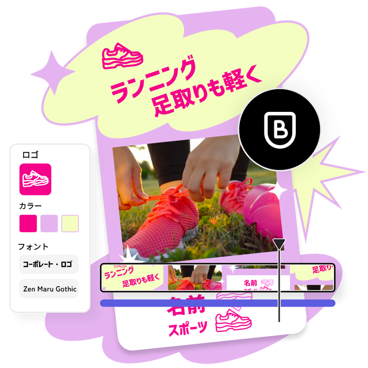 Adobe Expressのブランドキットを使えば、視聴者に独自の価値をすぐに伝えられます。独自の価値を持った素材を作成して、各種広告プロジェクトにブラウザー上ですばやく追加することで、すべてのキャンペーン素材で一貫した雰囲気を実現できます。ロゴをアップロードし、配色とフォントを選択しましょう。ロゴをお持ちでない場合も、 Adobe Expressを使って無料でロゴを作成できます。