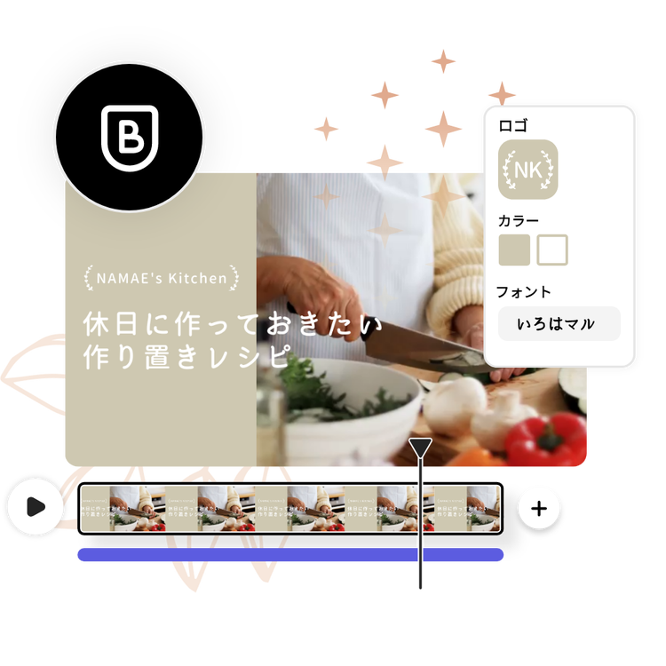 イントロ動画にご自身のブランド素材を追加すれば、認知度が上がります。ブランドキットを使って、ロゴなどの素材をアップロードし、テーマカラーやフォントを選択しましょう。色やフォントを指定して、Adobe Expressでオリジナルのロゴを作ることもできます。魅力的な組み合わせが完成したら、イントロ動画やあらゆるプロジェクトに自動的に使用されます。動画制作の経験がなくても大丈夫です。