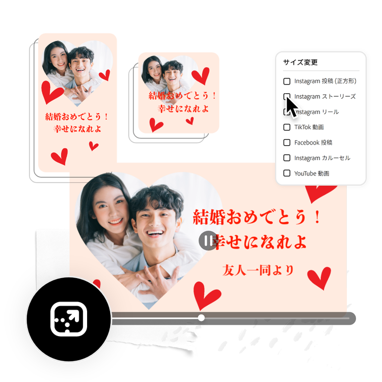 サイズ変更機能を使ってワンクリックで動画のサイズを調整できるので、お気に入りのSNSサービスで特別な日を共有できます。