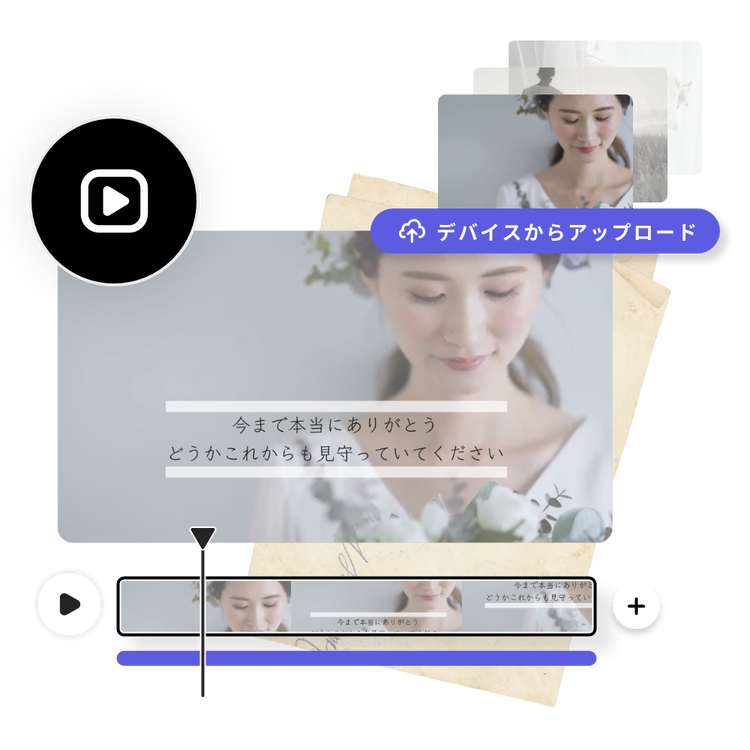 結婚式の準備は大変なこともありますが、特別な日を共有するための動画作りは違います。Adobe Expressのドラッグ&ドロップでかんたんに操作できる動画編集機能を使えば、お気に入りの写真と動画をすぐに組み合わせられます。結婚式のテーマカラーを動画に追加したり、何千もの美しいフォントからお好きなものを選び、お二人の愛の物語を伝えましょう。二人の思い出の曲や、ロイヤリティフリーのAdobe Stockのサウンドトラックの中から選んだ音楽を入れることで、いつまでも記憶に残る作品に仕上げられます。