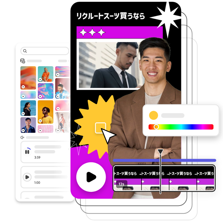 Adobe Expressのオンライン動画編集機能があれば、目を引く動画を作るのに必要なものがすべて手に入ります。静止画像と動画を組み合わせて一本の動画にすれば、視聴者の目を引く方法でビジネス、製品、またはサービスをアピールできます。プロジェクトに好きなだけ動画をアップロードし、カットして短くしましょう。また、おすすめのフォントも提案されますので、メッセージをスタイリッシュに伝えられます。